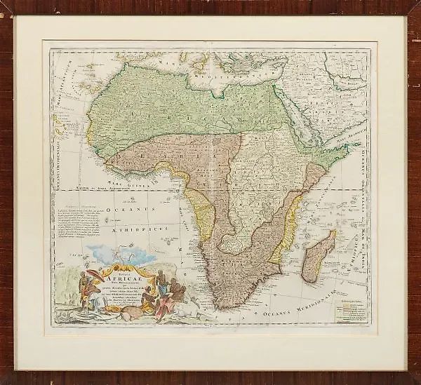 "The Image of All Africa" is the translated title of this colored copper engraving created by Johann Baptist Homann around 1720 in Nuremberg. It presents a comprehensive overview of Africa, including its adjacent seas. The title inscription block is decorated with ornamental figures. The coloring was added later. The plate measures approximately 49 x 56.8 cm. It is set in a frame.