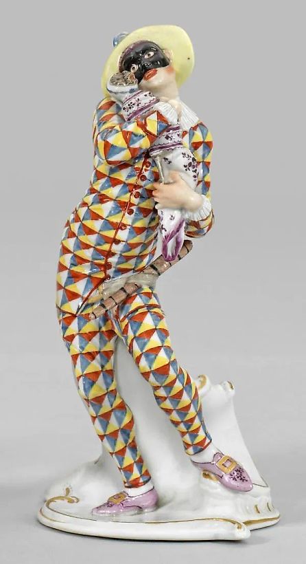 На пьедестале в стиле рокаиль с волютами насажен поднимающийся стержень, стоит стоящий комик в клетчатом костюме с белым воротником, носящий желтую шляпу и черную маску, держащий в руках обезьянку-мартышку. Полихромная живопись с золотым стафажем. Возможно, Франц Антон Бустелли, около 1760 года. Марка производителя. Высота 19 см. Фарфоровая фигурка Мезеттино из Комедии дель арте. Марка производителя. Нимфенбург. XX век.