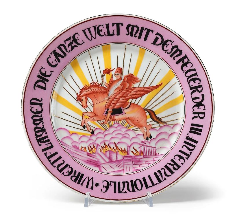 Плоская русская тарелка "МЫ ВСЮ ВСЕЛЕННУЮ ВОСПЛАМЕНИЛИ ОГНЕМ III ИНТЕРНАЦИОНАЛА" на ободе тарелки, изображение "Красного Гения" на дне, корпус с золотой и фиолетовой окантовкой, обод с лозунгом, написанным на светло-фиолетовом фоне, на дне всадник на красном крылатом коне, держащий горящий факел в правой руке, на фоне золотых и желтых солнечных лучей, облаков с фиолетовой окантовкой и горящего города, диаметр 27 см, Товарищество М. С. Кузнецова, надпись синим цветом сверху — К. П. М. = Кузнецовская Фарфоровая Мануфактура, DREYLINGSBUSCH, коричневая русская надпись "Художник Алиса Голенкина", клеймо молота и серпа с шестерёнкой, дата 1922 года (р.) Алиса Голенкина, 1882-1973, написано по мотивам произведения "Архангел Михаил, командир армии" из серии "Мистические образы войны" 1914 года Наталией Гончаровой, важной и известной русской художницы. DREYLINGSBUSCH — деревня рядом с Ригой.