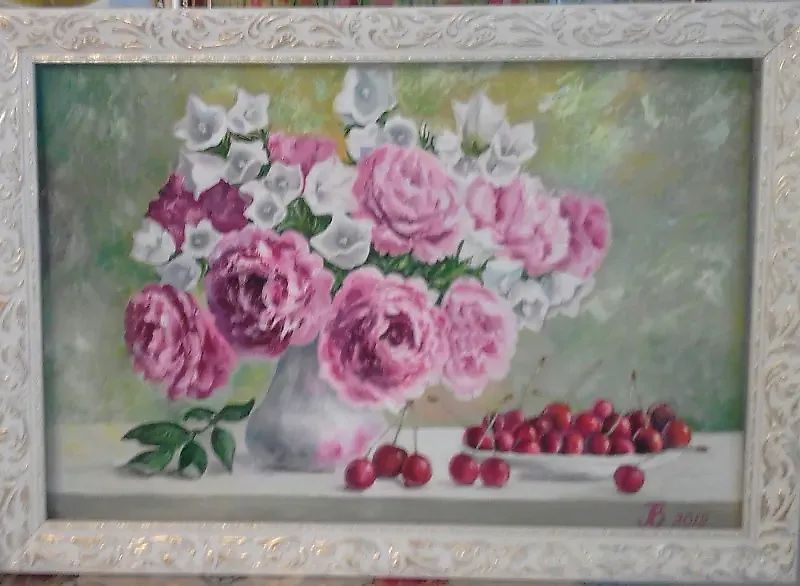 Букет розовых пионов с колокольчиками, картина выполнена маслом, кистью и масхетином, пахнет свежестью и весной. Прекрасный подарок ко дню рождения девушке.