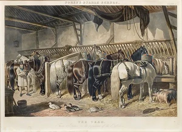 (1795 год, Саррей - 1865 год, Меопем Парк возле Танбридж Веллса) после "Команда". Оригинальное название: Колорированная акватинта/бумага, 1846 год. Гравировка Джона Харриса (1791-1873). Опубликовано издательством Форес, Лондон. Планка 4 из серии "Сцены из лесных конюшен". Размеры: 44 см x 67 см. В раме. История происхождения: северногерманская семья старых хозяев отеля. Эта колорированная акватинта выполнена Джоном Харрисом (1791-1873) по мотивам работ Джона Фредерика Херринга старшего (1795-1865) и опубликована Форес, Лондон в 1846 году. Это планка 4 из серии "Сцены из лесных конюшен".