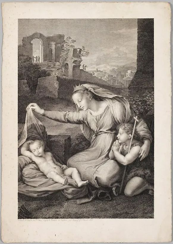Медная гравюра на бумаге, 1805 год. Нарисовано Филиппом Шери (1759-1838) по картине Рафаэля (1483-1520), гравюра Франсуа-Робера Ингуфа (1747-1812). На обороте имеется надпись "La Vierge au linge" (Дева с полотенцем). Изображение имеет размеры 35,2 см x 2,8 см, а лист - 42,4 см x 29,7 см.