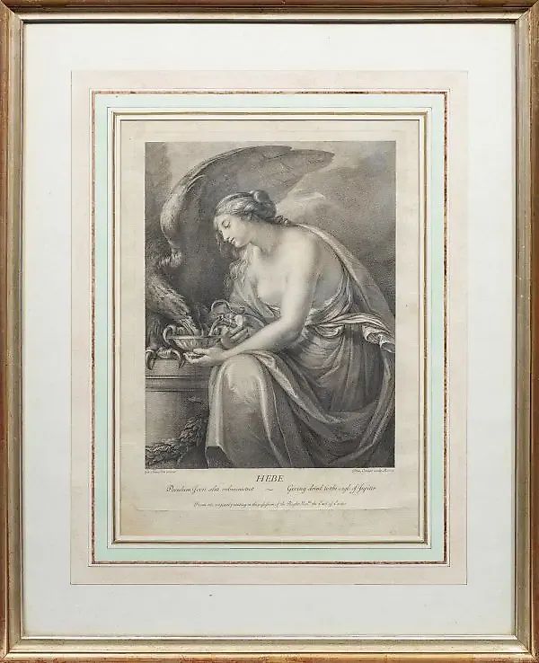 (1723 Ланарк/Ланаркшир/Шотландия - 1798 Рим) после "Хебы". Оригинальное название медный гравюра/бумага. Гравировано Доменико Кунего (1727 - 1803), опубликовано в Риме. Хеба, богиня молодости, наливает воду в чашу, чтобы питать Юпитера в образе орла. Размер пластины 39,8 см x 28,8 см. Зарамочено. Происхождение: Северногерманская старая семья отельеров. Медная гравюра Доменико Кунего (1727 - 1803) по Гавину Хамильтону (1723 - 1798). Опубликовано в Риме.