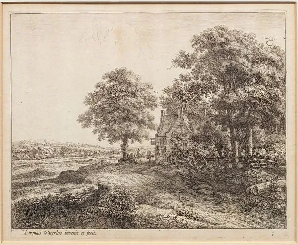 (1609 Лилль или Утрехт - 1690 Утрехт) "Большая липа перед гостиницей". Оригинальное название гравюры на бумаге. В плите надпись "Антониус Ватерлоо изобрел и сделал / 1". Плита 1 из серии из 6 пейзажей, каталогизированная как Голландская Голштейн L. 251.113-118. Размер плиты 23,5 см x 29 см. Оформлена в раму. Происхождение: Северная немецкая семья гостиничных предпринимателей.
