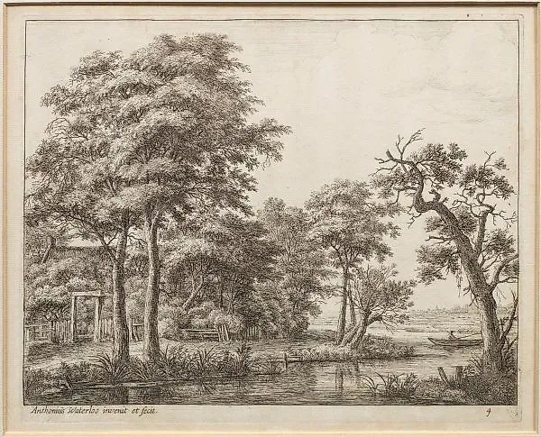 (1609 Лилль или Утрехт - 1690 Утрехт) "Ферма у воды". Оригинальный титульный эскиз на бумаге. Написано на пластине "Анто́ниус Ватерло́о изобрёл и сде́лал / 4". Пластина 4 из серии 6 ландшафтов, каталогизирована как Hollstein Dutch L. 251.113-118. Размер пластины 23,5 см x 29 см. В рамке. Происхождение: семья северогерманских старых гостиничных предпринимателей.