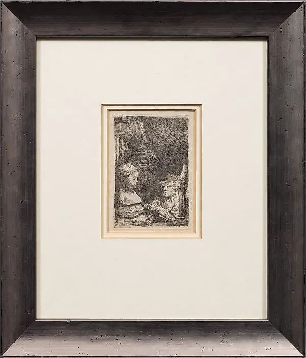(1606 Лейден - 1669 Амстердам) "Человек, рисующий с модели" (Человек, рисующий с отливка). Оригинальное название Этска / Бумага с наложением, около 1641 года. С оборотной стороны имеется рукописная аннотация с датой 1842 года (предположительно, ссылка на коллекцию). III. Состояние (по Хольштейну) с изменениями (не Рембрандта) в том числе на лбу бюста, щеке художника и прежнем белом месте между свечой и книгой. Хольштейн B 130/III. Пластина 9,6 см х 6,5 см. Лист 12,6 см х 9,5 см. Рамка. Этска на бумаге с наложением, около 1641 года. Третье состояние (Хольштейн B 130). Незначительная исправленная рвань.