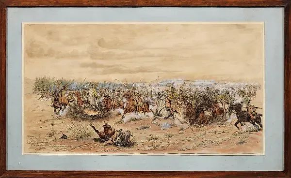 Французский художник и рисовальщик двадцатого века. "Ноябрь 1806 года, Лазаль возглавляет атаку 5-й и 7-й гусарской бригады". Оригинальное название: Многолюдная сцена из наполеоновских войн с "Бригадой ада", возглавляемой продвигающимся генералом Антуаном Шарлем Луи де Лазалем (1775-1809). Он достиг капитуляции Штеттина в конце октября 1806 года, за которой последовало преследование войск генерала Блюхера и капитуляция Любека. 21 ноября 1806 года 5-й и 7-й гусарские полки приняли участие в великой параде победы для Наполеона на замковой площади в Берлине. Прозвище "Бригада ада" основано на 26-дневном крайне напряженном путешествии, пройденном на расстояние 1160 километров. Тушь и акварель с выведением на бумаге. Подписано и датировано 1964 годом, названо и посвящено. 34,8 см x 64 см. Оформлено.
