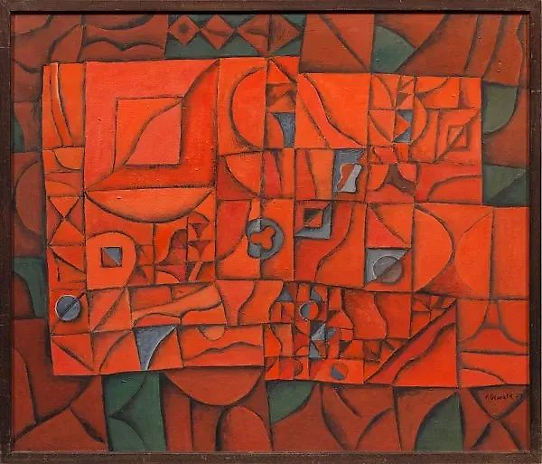 (1911 Вирнхайм - 1990 Карлсруэ - Гретцинген) "Композиция в Красном", композиция от Деваальда, характеризуется сниженной яркостью цветов и орнаментально-геометрической абстракцией, напоминающей работы Пауля Клее, под влиянием которого находился Деваальд с 1960-х годов. Масло, холст; в раме. Размеры произведения искусства - 73 см х 87 см, подписано и датировано (19)77 годом. На обороте находится ярлык выставки, предоставляющий дополнительную информацию.