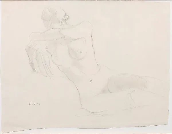 (Активный в 20 веке) Женский акт карандашом на листе бумаги (с водяным знаком). Подписано и монограммировано "E.H." и датировано (19)38. Штамп на обороте "СБОР ПРОФ. ДР. КУРТ ХЕРБЕРТС" красным цветом с инвентарным номером "B 68/387". Лист примерно 28,5 см x 36 см. В раме. Штамп относится к выдающемуся химику, предпринимателю, владельцу лакокрасочного завода и коллекционеру искусства, которые привлекали к работе известных художников и мастеров Баухауса, таких как Вилли Баумейстер, Оскар Шлеммер и Георг Мухе, с 1937 по 1944 год. Происхождение: Коллекция Проф. Др. Хербертс (1901-1989).