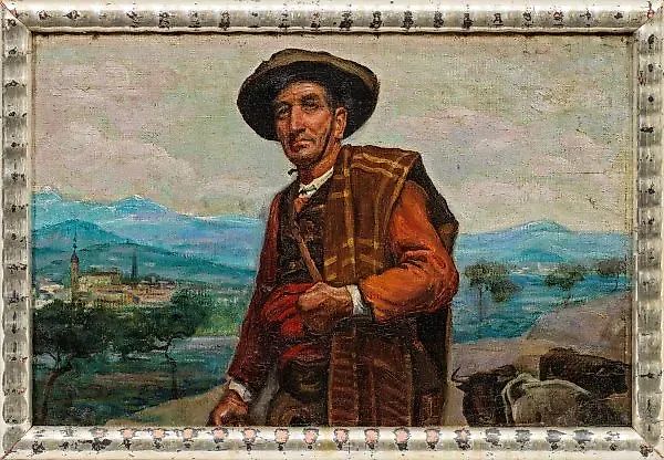 (Активный в первой половине XX века) Портрет аргентинского гаучо. Реалистичная, выразительная характеристика доминирующего гаучо, стоящего на переднем плане в полфигуры, рядом с ним в среднем плане несколько скотов, на заднем плане город и снежные вершины горного хребта. Масло, холст; на обороте неразборчивая надпись; 25 см x 39 см. В раме. Немецкий художник, активный в первой половине XX века. Неопределенно подписан с обратной стороны.