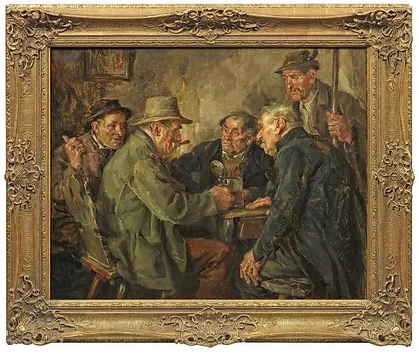 (Active around 1900) Tavern scene with five men. Painted scene with a fast, relaxed brushwork, highlighted by the expressive depiction of the characterful figures engaging in a dispute with each other. Oil on canvas; 71 cm x 89 cm. Framed. Created by a South German genre painter active circa 1900.