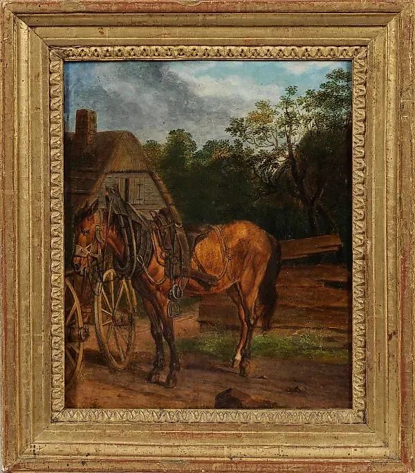 (Активный во второй половине XIX века) Лошадь с упряжкой и седлом перед амбаром, карета с запряженной и оседланной лошадью, готовая к отправлению. Хорошо и естественно нарисованное животное в стиле художников животных, таких как Иоганн Адам Кляйн (1792-1875) или Рихард Бенно Адам (1873-1937). Масло на бумаге, закрепленное на деревянной панели. Надпись иностранной рукой на обороте. 20,5 см х 16,2 см. В раме. Немецкий художник животных, активный во второй половине XIX века; Масло на бумаге, закрепленное на деревянной панели. Надпись иностранной рукой на обороте.