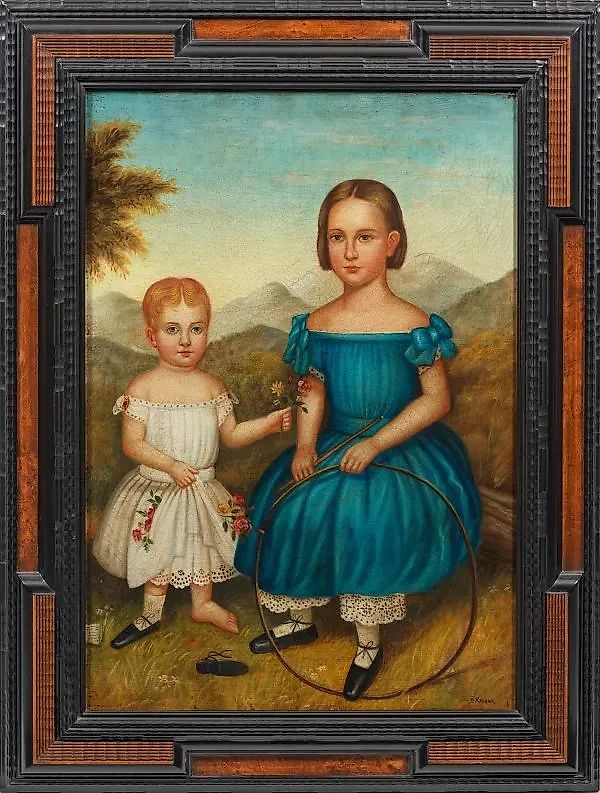 (Активны во второй половине XX века) "Фанни и Элла Грейвс из Конвея, Массачусетс и Генри Стрит, Нью-Йорк". Оригинальный заголовок описывает нежно характеризованный портрет детей, написанный Джозефом Гудхью Чандлером (1813-1884) в 1854 году. Масло на холсте; подписано и оформлено в раму. Сравните с аукционом Christie's, 20 января 2023 года, лот 535. После Джозефа Гудхью Чандлера (1813-1884). Масло на холсте. Подписано.