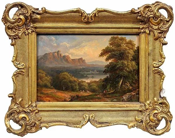 (1813 Берлин - 1870 там же) Ландшафтная вечеринка в Богемии, окунутое в атмосферный свет, романтический горный пейзаж на саксо-богемской границе недалеко от Ойбина. Масло на дереве. Подписано и имеет монограмму. На старом бумажном ярлыке с именем художника, местоположением и монограммой указано, что произведение создано в 1864 году. Размеры: 18,5 см x 28 см. В раме.