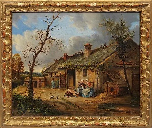 (Активно в середине 19-го века) Сельская идиллия перед крестьянской хижиной в позднеосеннем пейзаже. Две женщины заняты разговором и рукоделием, тогда как у их ног двое маленьких детей полностью погружены в свою игру. На заднем плане еще один мальчик спиной к зрителю. Тонко и любяще сфотографированная жанровая сцена в радостном настроении. Масло, холст на подрамнике. Непрекратно подписано; трудно разобрать на обороте, размером 33 см x 41 см. В раме.