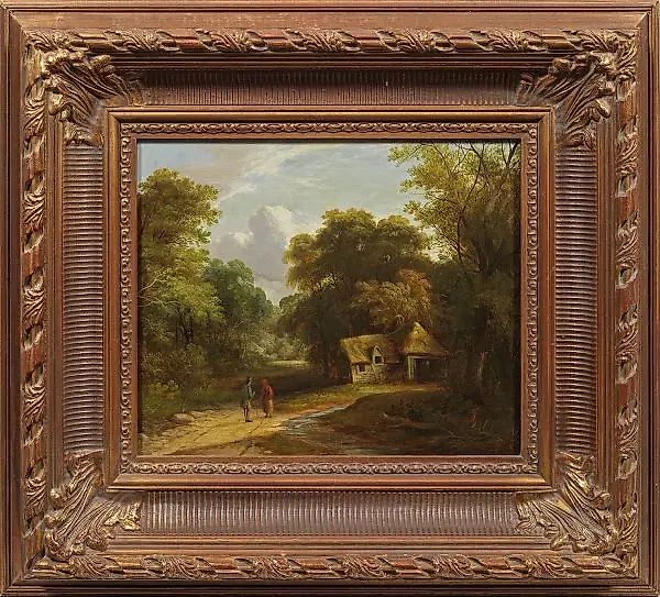 (1803 Норфолк - 1879 Норвич) Лесной пейзаж с коттеджем и фигурами на дорожке. Романтическая работа английского художника-пейзажиста Лэдбрука. Лэдбрук рос в семье художников и в основном рисовал лесные пейзажи. Уже в 1820 году он опубликовал серию из восьми литографий под названием "Выбранные виды Норвича и его окрестностей". В 1821/22 годах он выставлялся в Королевской академии в Лондоне и был частым участником выставок в Британском институте до 1873 года. Масло, холст, переклеенный. С монограммой. Размеры: 38 см х 46 см. Запечатанная рама.