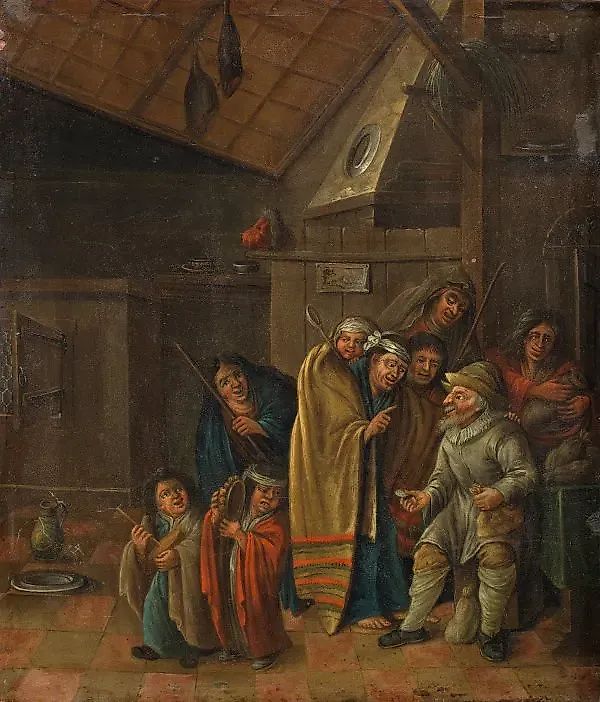 (Активный в 18/19 веке) Общество на фоне сельской интерьерной сцены, под влиянием Давида Теньерса, Адриана фан Остаде и Адриена Броуера. На изображении изображен сидящий старик, окруженный южной группой (возможно, так называемыми путешественниками), дающим серебряную монету из изобильно наполненной денежной сумки, в то время как двое детей играют на бубене и рокошетают глухой горшок (бруммтопф). Масло, медная пластина, 27,6 см х 23,5 см. Голландский художник, активный в 18/19 веке. Масло, медь.