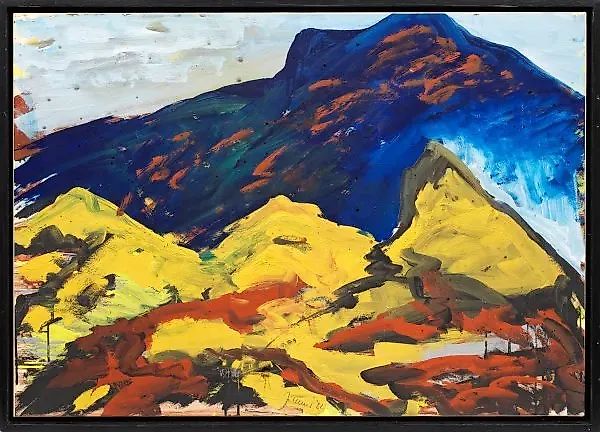 (Родился в 1948 году в Планегге, рядом с Мюнхеном) "Mountain" - Ландшафт 1982 года является неоэкспрессионистской работой, возникшей из значительной, личной и художественной фазы потрясений. Вместе с Райнером Феттингом, Хельмутом Миддендорфом, Саломе и другими, Циммер основал галерею самопомощи художникам "Galerie am Moritzplatz" в Берлине в 1977 году, которая существовала до 1981 года. В 1980 году работы этих так называемых "Юнген" (или также Новой дикости) были впервые представлены широкой публике в Берлинском здании "Haus am Waldsee" под названием "Heftige Malerei" (Интенсивная живопись). После того, как Циммер уже нарисовал свои первые "горные" пейзажи в 1978 году, он отправился на работу в Цвицельштайн (Ойцталь/Тироль) в летние месяцы 1980 года, где возникли новые группы работ, состоящие из сильных образов "горы", "водопадов" и изображений увеличенных камней. В 1981 году Циммер был представлен на легендарной выставке "Rundschau Deutschland", а в 1982 году он провел свою первую персональную выставку в Гронингене и стал стипендиатом Виллы Массимо в Риме, где жил и работал почти два года. В 1984 году Циммер закрыл свою берлинскую студию, переехал в Поллинг/Верхняя Бавария и взял на себя бывшее монастырское имущество. Гуашь и смешанная техника на бумаге, приклеенной на холст. Подписано и датировано (19)82 годом. 70 см x 100 см. В раме.