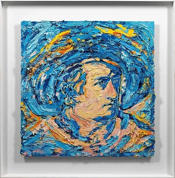 (Родился в 1954 году в Веймаре) Иоганн Вольфганг Гёте. Портрет Гёте, созданный в сниженных желто-синих тонах, с очень плотным, рельефным нанесением краски, вдохновленный знаменитым произведением «Гёте в Римской кампании» Иоганна Генриха Вильгельма Тишбайна из 1787 года. Это произведение, получившее большую популярность и абсолютную узнаваемость, особенно после того, как Энди Уорхол процитировал изображение Гёте с широкополой шляпой в своей известной серии шелкографий, характеризуется своей чернотой. Художник, который учился в Кельнском университете прикладных наук у Вернера Шрайферса с 1976 года и у Герхарда Хёме в Дюссельдорфской академии с 1978 года, с раннего этапа своего творчества занимается темой воссоединения Германии и последующего образования Европейского союза, а также истории и значимости своего родного города и его важных личностей. Он считается одним из самых важных немецких художников настоящего времени и создал обширное творческое наследие, отличающееся выдающейся прорицательной силой, вдохновленное его главным кумиром Винсентом Ван Гогом. Масло на картоне, прикрепленное на деревянную панель. Приблизительные размеры: 97 см x 97 см. В раме. Происхождение: Приобретено непосредственно из художественной мастерской художника в 2017 году.