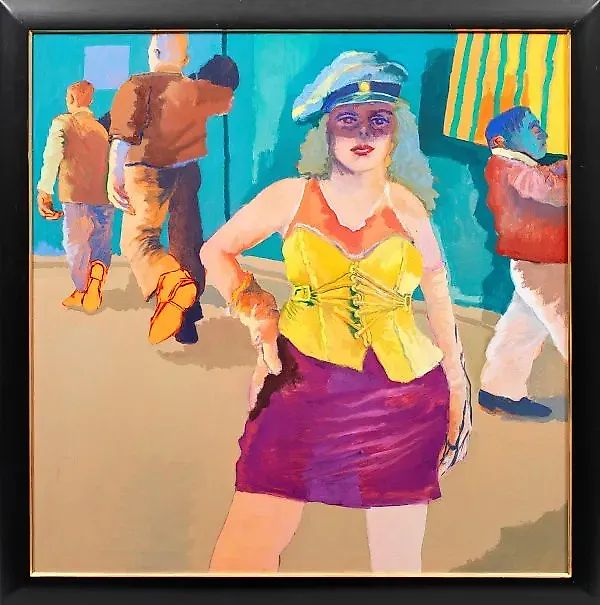 Родился в 1955 году в Штутгарте и базирующийся в Мюнхене художник представляет сцену из красной феерической зоны, названную "Доминантный Желтый". На переднем плане изображена привлекательная молодая женщина, стоящая в желтом корсете, малиново-красной мини-юбке, перчатках и небрежно надетой шляпе. На заднем плане она проходит мимо трех мужчин, кажущихся незатронутыми. Использованы яркие и выразительные цвета, это ранняя работа Кейльбаха, который в основном изображает современные повседневные сцены в своей фигуративной живописи. Она передает чувство радости в жизни, а иногда также выражает определенную меланхолию. Используемой средой является масло на хлопке (лене). С оборотной стороны она подписана, названа и датирована 1/2/(19)90. Размеры составляют 110 см х 110 см. Она оформлена.