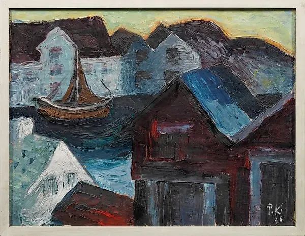 (1892 Бремерхафен - 1977 там же) "Квитсой I". Оригинальное название - пастозное, динамичное нанесение красок, изображающее вид небольшой гавани в норвежской муниципалитете Квитсой. Масло, холст. Подписано на обороте; названо, пронумеровано "125" и неразборчиво датировано карандашом. 50,5 см x 65,5 см. Оформлено в раму. Общая литература: Аня Беншейдт и Альфред Кубе: Каталог "Пауль Кунце. Северогерманский экспрессионист (1892-1977)", Исторический музей Бремерхафена/Музей Моргенштерна, Бремерхафен 2012 год. Масло, холст. Монограмма и дата (19)36 года. На обратной стороне подписан, озаглавлен, пронумерован 125 и датирован 1936 годом.