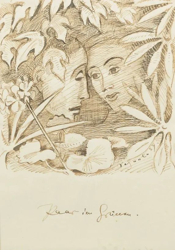 (1905 Франкфурт - 1944 Смоленск) "Пара в зеленом". Оригинальный редкий орнаментально-фигурный лист от Шеле, который считается одним из художников потерянного поколения. Обучался с 1922 года в Франкфуртской и Оффенбахской школах прикладного искусства у Альберта Виндиша и Рудольфа Коха, затем перешел во Франкфуртскую школу Стеделя в 1924 году, чтобы изучить французскую картины, представитель экспрессионизма. В 1927 году переехал в Берлин, где добился первых успехов на выставках и открыл для себя абстракцию в 1930-х годах. Однако в 1937 году некоторые работы Шеле были признаны "дегенеративными" и в 1939 году ему был наложен общий запрет на выставки. Многие его работы были уничтожены в 1943 году вместе со студией из-за последствий войны. Чернильная рисунок в сепии / бумага. Подписано и датировано (19)39 и названо посередине. Сзади маркировка поместья с номером Z54. Приблизительно 28 см х 20 см (вырез материала). Завернуто. Коричневые чернила на бумаге. Подписано, датировано (19)39 и подписано названием. Маркировка поместья с номером Z54 с обратной стороны.