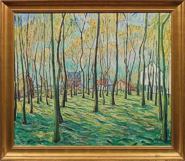 (1882 Маргграбова / Восточная Пруссия - 1919 Берлин) "Осенний пейзаж". Оригинальное название "Вид сквозь рощу с изящными, светлыми деревьями на группу отдельных домов". Выполненный с ритмичными, переплетающимися мазками и пастозным нанесением красок, осенний пейзаж отражает влияние Винсента Ван Гога на Тео фон Брокхузена. Брокхузен учился в Художественной академии в Кенигсберге с 1897/98 по 1903 год. В 1904 году он переехал в Берлин и стал членом Берлинской Секцессии в 1906 году. Он регулярно участвовал в их выставках до своего ухода в 1913 году. Поль Кассирер, владелец галереи и важный покровитель Брокхузена, поддерживал его с 1906 по 1915 год. Уже в апреле 1906 года, Ганс Розенхаген похвалил Брокхузена в "Кунст фюр алле" в обзоре выставки Кассирера, заявив, что его выставленные картины были "полны тонов, цвета и мужества". С 1907 года он проводил летние месяцы ежегодно в Баумгартенбрюке на озере Швиеловзее, где создавал пейзажные картины, изображающие интенсивно воспринимаемый Бранденбургский пейзаж в изменении дней и времен года. В рамках большой серии пейзажных картин он изобразил мотивы деревьев, цветущие плодовые деревья в Хавелланде, а также аллеи и деревенские улицы. В 1908 году Кассирер организовал специальную выставку пейзажей Брокхузена и других из окрестностей Берлина, которую критик правильно описал следующим образом: "Некоторые из этих работ, сильно влиянных Ван Гогом, были только сырыми и неловко созданными без нежных художественных чувств, но они содержали обещания и, прежде всего, сильную творческую силу" ("Кунстхроник", Neue Folge, 19-й год, No. 21, 3 апреля 1908, стр. 358). В 1912 году он получил престижную премию Вилла Романа. После возвращения в Берлин в 1913 году он стал одним из основателей и членом правления Свободной Секцесии в 1914 году. В 1915 году Брокхузен разорвал отношения с владельцем своей галереи Полем Кассирером, незадолго до своей смерти в 1918 году он поручил своим произведениям новому владельцу галереи Фердинанду Меллеру (который позднее также получил его имущество). В 1919 году Брокхузен провел большую персональную выставку в галерее Меллера в Берлине, после чего последовали еще три памятные выставки до 1931 года. После Брокхузена, который долгое время оставался малоизвестным из-за порочения современного искусства национал-социалистами, его работы стали все чаще открываться с момента крупной выставки Брокхузена в 1999 году в Берлине и Регенсбурге. Масло на холсте; подпись; обратная сторона оригинальной этикетки с обозначением и названием "ф. Брокхузен, № Б. 54, Осенний пейзаж". 80 см х 96.5 см. Оригинальная рама. Происхождение: Из коллекции Эллы Веллехенер (1872-1937), прокурора художественного салона Пауля Кассирера, Берлин; в семейной собственности с тех пор.