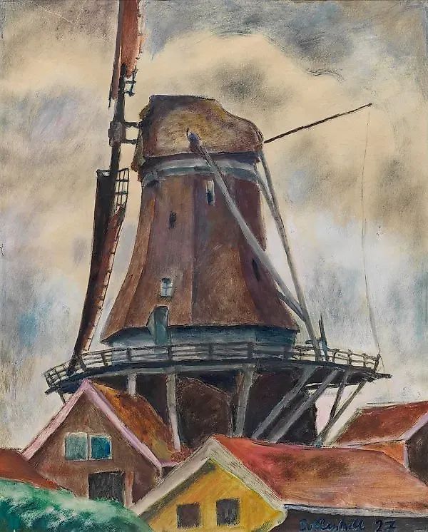 (1887 Вупперталь-Эльберфельд - 1946 Вюльфрат) Изображение ветряной мельницы в стиле Нойе Захлихкайт. Доллершелл относится к группе художников, известной как "Потерянное поколение". Он получил свое художественное образование, среди прочего, в Мюнхенской художественной академии под руководством Анжело Янка и Франца фон Штука, а также с 1912 года в Париже. Там он познакомился с Вильгельмом Лембруком и в 1912 году впервые выставил свою работу "Молодой парижанин" на выставке Salon d'Automne. После Первой мировой войны Доллершелл переехал в Вупперталь, где жил несколько лет в Париже с 1927 года. После 1933 года многие его работы были признаны "дегенеративными" и изъяты из публичных коллекций искусства. Большая часть его творчества была уничтожена во время бомбардировки Вуппертала в 1943 году, гуашь/бумага. Подписано и датировано (19)27. Разрывы в верхней части. 45 см x 37 см (вырез из паспарту). Оригинальная рама. Происхождение: Из коллекции сотрудника музея Фон дер Хейдт и близкого друга Мии Доллершелл, вдовы художника; впоследствии перешло в семью. Гуашь на бумаге. Подписано и датировано (19)27. Разрывы в верхней части. Оригинальная рама.