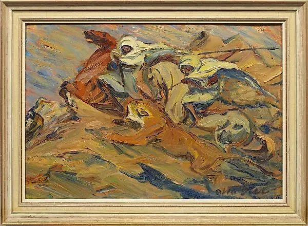 (1884 Нойштадт а. д. Хардт - 1957 Бад-Дюркхайм) "Охота на льва". Оригинальное название Сцена из Северной Африки с двумя бедуинами верхом на лошадях в бою с львом. Созданная Диллем в 1921 году, эта ранняя работа выполнена виртуозной, быстрой, широкой, свободной мазкой и импасто нанесением краски. Она является потрясающим данью известным картинам охоты на льва Рубенса и Делакруа. В таких изображениях наездников и львов, Дилль смог продемонстрировать свое великое мастерство в изображении мимолетных движений. Изображения наездников и лошадей были, наряду с хищными кошками, основными темами картины, где Дилль учился в Мюнхенской академии с 1908 по 1914 год и как мастер-студент у Генриха фон Цигеля с 1909 по 1913 год. В начале 1920-х годов Дилль неоднократно занимался мотивом охоты на льва, в 1922 году Дилль представил сходную "Охоту на льва" на Великой Берлинской художественной выставке, а в 1922/23 году в Мюнхенской галерее Таннхаузер была организована выставка Дилля с серией его последних картин, в которой могла быть представлена и настоящая работа. В 1923 году влиятельным художественным журналом "Die Kunst für alle" (стр. 259-265) была опубликована большая статья о Дилле, написанная искусствоведом доктором Вилли Бургером, который также пишет о его картинах охоты на льва: "Среди лучших работ художника безусловно стоят те изображения наивысшей интенсификации движения, борьбы, когда преследуемый хищник, лошадь и наездник сворачиваются воедино, образуя картину самой захватывающей, трогательной жизни (...) Смелый, величественный жест боевых изображений полностью соответствует весу и энергии мазка, подсвечиваемого разноцветными вспышками, ритмически разделяющими полотно на широкие, большие области". Масло на картоне. Подписано и названо на обратной стороне с этикеткой, датировано 1921 годом; этикетка Модерн Галереи Таннхаузер, Мюнхен (1921-1928) с номером 3853. 47 см x 69,5 см. В раме. Происхождение: немецкая частная коллекция, Рейнланд-Пфальц.