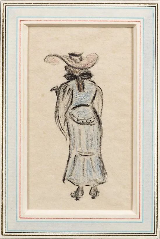 (1858 Радебург - 1929 Берлин) "Я себя привела в порядок". Оригинальное название: Юмористический рисунок молодой берлинской женщины в элегантном платье с огромным шляпой. Это произведение иллюстрирует необыкновенный талант Цилле по отображению характера, особенностей и сути изображенных лиц как отдельных личностей и как типов. Он достигает этого, сконцентрировавшись только на самом необходимом и компрессируя свои образы. С помощью нескольких мягких, плавных линий и штрихов он захватывает контуры и тело, дополняя их тонкой, плоской раскраской. Угольный рисунок с цветным мелом на японской бумаге. С обратной стороны есть два клейма из наследия в красной краске: "Генрих Цилле" (Розенбах 1) и "Начало профессора Генриха Цилле" (Розенбах 4). Есть следы закрепления, легкое пожелтение и пятна. 18,7 см х 13,2 см. В раме. Происхождение: Из художественного наследия художника управляемого его сыном Вальтером Цилле.