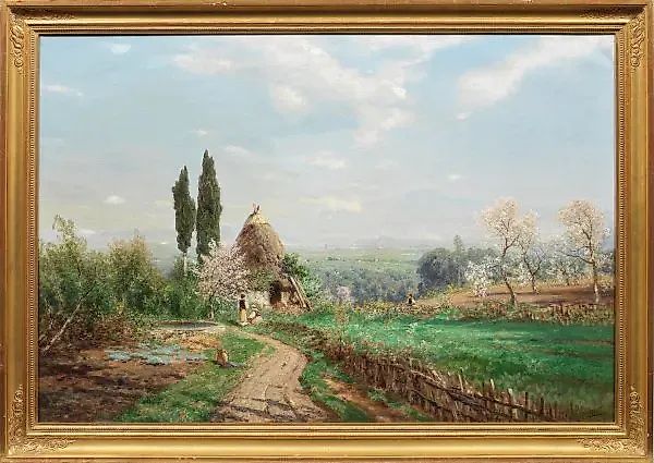 (1842 Гамбург - 1923 там же) «Весна в Кампанье». Оригинальное название Веселый, гармоничный, наполненный светом пейзаж с широким видом с высокого места на равнину Кампанье. На переднем плане живописная хижина с конусообразной крышей, два кипариса, возвышающихся в небо, и цветущие фруктовые деревья, а также молодая пара и другая отдельная фигура. Написано в яркой, пастельной гамме цветов и частично мягкими мазками кисти, создавая атмосферный пейзаж. Луттеррот учился с 1864 по 1867 год у Освальда Ахенбаха в Дюссельдорфской академии. С 1868 по 1870 год Луттеррот провел время в Риме и совершил учебные поездки по всей Италии. По возвращении в родной город он завоевал значительную репутацию как пейзажист, выходящий далеко за пределы Гамбурга. Особое внимание к нему проявляли лично княжеская пара Фридрих Вильгельм и Виктория. Одной из его основных тем были итальянские пейзажи и венецианские мотивы. Масло, холст; подписано. Заглавие и надпись "A Lutterroth Hamburg Uhlenhorst" на оборотной стороне. 80,5 см x 118,5 см. В раме.