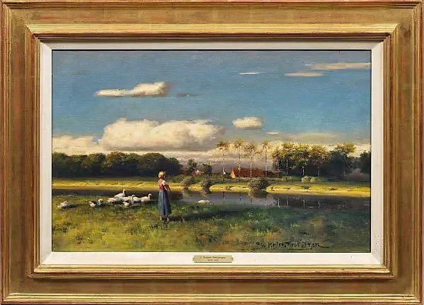(1854 Ройтлинген - 1920 Мюнхен) (1854 Ройтлинген - 1920 Мюнхен) Крестьянка, пасущая стадо гусей у реки и Фермерский домик в вечернем свете стиля - мотив, характерный для художника, чьи изображения отличаются интенсивными, свежими, яркими акцентами цвета и сильными, впечатляющими контрастами света. Келлер-Ройтлинген, изучавший в Штутгарте и Мюнхене, особенно увлекался мотивами, такими как фермы и крестьянки, занимающиеся пасекой уток или гусей, благодаря их глубокому эмоциональному содержанию и возможности изображения атмосферы, света и цвета в одной картины. Помимо выставки своих работ в Стеклянном Дворце, он также показывал свои картины на Мюнхенской сессии, которую он основал в 1893 году. Масло, холст; подписано; 40,5 см x 60,5 см. В раме.
