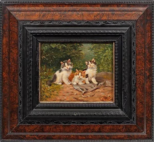 (1892 Грединг - 1973 Мюнхен) Три маленьких котенка на белом фартуке, три игривых котенка-мальчика в летнем зеленом пейзаже. Тонко наблюдаемый, характерный, ярко изображенный мотив художника, специализирующегося на изображении кошек. Живописец животных, также известный как "Katzenkögel" из-за своей основной темы, находится в традиции мюнхенского художника Юлиуса Адама, который также в основном занимался изображением кошачьих мотивов. Масло, деревянная панель. Подписано. На обратной стороне надпись с именем художника и местом нахождения Мюнхен. 21,5 см × 26,3 см. В раме.