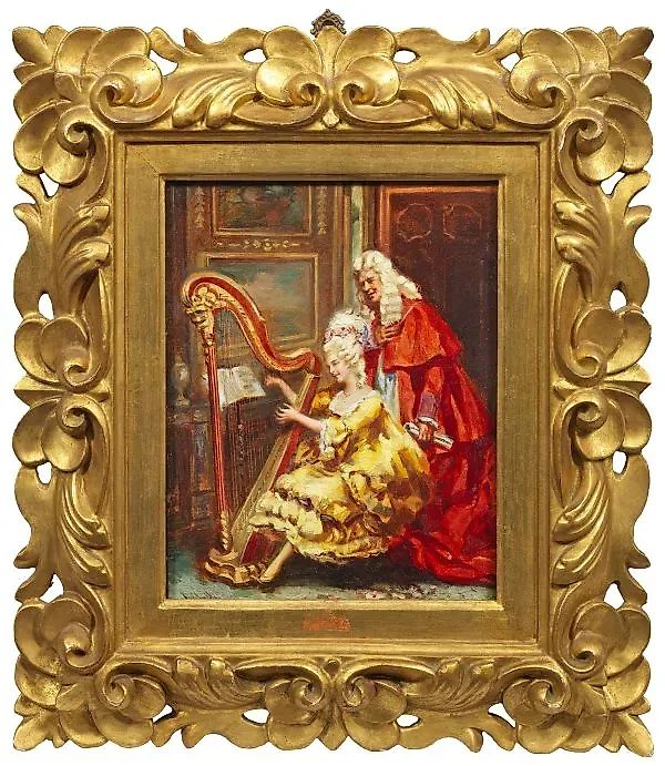 (1876 Рим - 1955 Флоренция) "Арфистка в дворцовом интерьере" изображает юную даму, играющую на арфе с почтением, в то время как ее учитель слушает звуки. Этот представительный кабинетный портрет Тордис, ученика Сальвадора Санчеса Барбудо в Риме, специализируется на выразительной, яркой цветовой гамме с акцентом на исторические предметы жанра. Масло, холст; Размеры: 27 см x 21.5 см. В раме. Подписано.