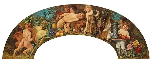 (1840 Сальцбург - 1884 Вена) Круг Ганса Макарта. Большая аллегорическая сверхдверная картина с фавнами и путти. Сегментарно-арочная композиция с декоративным изображением. На левой стороне молодые фавны и путти с фруктами и катаньем большой тыквы; на правой стороне путто с колчаном и охотничьим рогом рядом со стилл-лайфом с охотничьей добычей, а также еще один путто с заказом на лобстер и кувшин на столике, в нижнем правом углу большие розовые цветы. Декоративная живопись эры Венской Рингштрассе, на которую повлияли не только принц-художник Макарт, который в 1870-х и 1880-х годах впечатлил своими великолепными картинами в традиции Тициана и Рубенса, но и роскошный "макартовский стиль", названный в его честь, который также формировал буржуазные и аристократические интерьеры его времени. Масло, холст; примерно 82 см х 221 см.