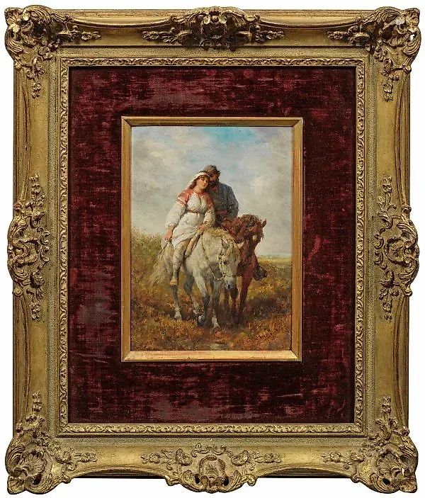 (1837 Франкфурт-на-Майне - 1907 там же.) Русская любовная пара на конях. Тонко исполненная жанровая картина Берса. Художник учился в Штедельском искусствоведческом институте во Франкфурте под руководством Якоба Бекера и Эдварда фон Штайнле. Значительное влияние на творчество Берса оказали его многократные поездки в Россию, во время длительных пребываний в 1867-1870 и 1877 годах в Смоленской губернии, где он детально изучал страну и ее народ. Благодаря мотивам, часто изображаемым им из русской народной жизни, его также называли "Русский Берс". В 1897 году Берс был назначен руководителем мастерской в Штедельском искусствоведческом институте и профессором в 1899 году. Масло на картоне. Подписано и датировано 1898 годом. 26,5 см х 19 см. В раме.