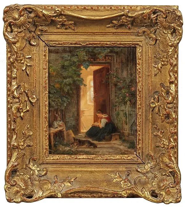 (1830 Тумлинген - 1900 Дюссельдорф) Читающая крестьянка во дворе, с полуприоткрытой дверью, залитой светом, сидящая на табурете, молодая девушка погружена в чтение. Очаровательная жанровая картина, любовно выполненная с вниманием к деталям, дюссельдорфским художником, обучавшимся в Штутгарте и Мюнхене. Масло, холст; подписано и охарактеризовано 1868 годом на лицевой стороне, с указанием местоположения Дюссельдорф и другой датой на обратной стороне; 27 см x 22 см. В раме.