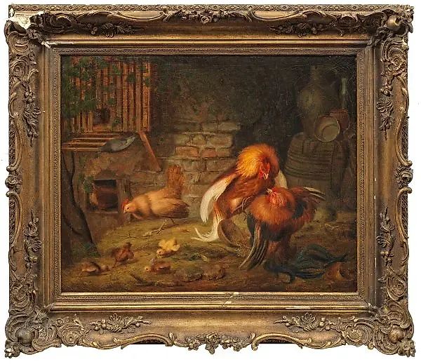 (1819 Фредриксхальд - 1867 Эйдсберг) Боевые петухи в стойле с курой, цыплятами и голубем. Тонко нарисованная работа норвежского художника, основным предметом его творчества были изображения животных, а также натюрморты и пейзажи. Принтц учился в Академии в Копенгагене с 1845 года, где он неоднократно выставлял свои работы в Шарлоттенборге с 1846 по 1852 год. В 1853 году он отправился учиться в Академию в Дюссельдорфе у Вильгельма Прейера, прежде чем вернуться в Норвегию. Он обладал исключительным талантом в изображении птиц. В Национальной галерее в Осло есть, среди прочего, картина "Лиса в курятнике" 1860 года. Масло, холст. Подписано и датировано 1858 годом. 53 см х 65.5 см. В раме.