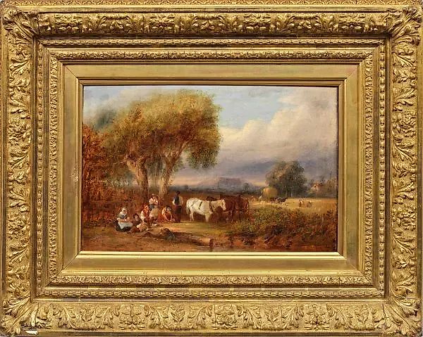 (1788 Саутгемптон - 1879 Бладон Лодж) "Поле урожая" (Эрнтэфельд). Оригинальное название. Атмосферные, тонкими слоями нарисованные сцены уборки урожая от Шайерса, который был одинаково талантливым как пейзажист и живописец фигур. Он экспонировал более 400 картин в Королевской академии, Обществе британских художников и Британском институте; работы принадлежат Тейт Галлери и Метрополитен Музею. Масло на холсте. (Штамп от Мэлвера Томаса, Лондон). Подписано и датировано 1848 годом. На оборотной стороне есть этикетка художника с надписью и местоположением Саутгемптона. 30,5 см x 43,5 см. В раме.