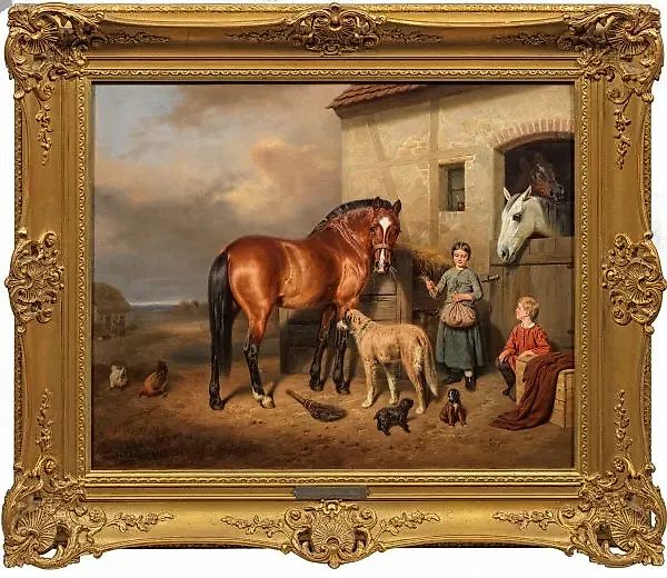 (1808 Magdeburg - 1886 Berlin) Visit of two children at the horse stable. Executed in a highly lively, finely detailed manner, this nature-inspired animal depiction showcases a delicate lacy style. The portrait and animal painter was a student of Franz Krüger and regularly attended the Berlin Academy exhibitions, including one in 1844 featuring an equestrian portrait of Prince Albrecht. In 1860, Randel displayed at the renowned art dealership of Louis Sachs in Berlin an identical or comparable painting titled "Pony," which, in addition to this, also depicted a young girl, a seated boy, a dog, and several young dogs in front of a house door (quote from "Die Dioskuren," issue 18, April 29, 1860, p. 150). Oil on canvas; signed and dated 1860. 52.5 cm x 63 cm. Framed.