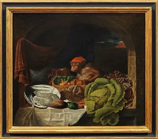 (1802 Литл-Истон/Эссекс - 1864 Саннисайд рядом с Биркенхэдом) после "Красной шапки" (Die rote Mütze). Оригинальный заголовок тщательно изображает известную картины 1847 года из Галереи Тейт в Лондоне. Лэнс Голт, в свое время считавшийся достойным послепредшественником великих голландских и фламандских художников натюрморта 17-18 веков, также вдохновляется эффективно освещенным мотивом, омываемым арочным открыванием. Обезьяна, шапка которой дает картине ее название, отражает человеческие образы и слабости. Такие изображения "обезьяньей комедии" пользовались большой популярностью в 19 веке. Лэнс наделяет обезьяну Красной шапкой свободы, будто это уже отсылка к 1848 году - году революций в Европе. Масло, холст; 43 см x 51 см, в раме. По мотивам Джорджа Лэнса (1802-1864). Масло, холст.