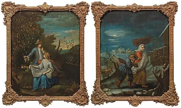 (Деятельный в 18 веке) Пара картин с аллегориями осени и зимы в виде пар. Пейзажные изображения, "Осень" изображает молодую пару, собирающую виноград, а "Зима" изображает крестьянскую пару, несущую дрова в снежном пейзаже с деревней в лунном свете. Масло на холсте, реставрировано; на обратной стороне шпалеры каждая с клеймом "FW". 90 см x 71 см. Хранится в оригинальных резных рококо рамах из массива дерева. Происхождение: Из частной коллекции в северной Германии; приобретено на аукционном доме Ханса Шталя, поместье Тёсторф, 08.05.1999, лот №120. Немецкий художник, деятельный в 18 веке; масло на холсте. Реставрировано. Каждое с клеймом "FW" на холстовой шпалере. Оригинальные резные деревянные рамы.