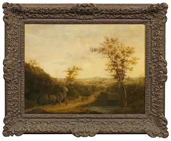 (1633 Эмден - 1686 Амстердам) приписывается; Пейзаж с путешественниками на тропе, произведение, характерное для художника, который учился у Яна Ассейлина в Амстердаме около 1650-1655 годов, а затем путешествовал по Франции, Германии и Италии до 1659 года. Фредерик де Мушерон изображал, наряду с итальянскими пейзажами, особенно богатые деревьями пейзажи с охотничьими обществами и пастухами, фигурная композиция которых часто заимствована у таких значительных художников, как Адриан ван де Велде, Николас Берхем и Иоганнес Лингельбах. Масло, холст на подрамнике; с подписью и нечеткой датой. 51,5 см × 68,5 см. В раме.