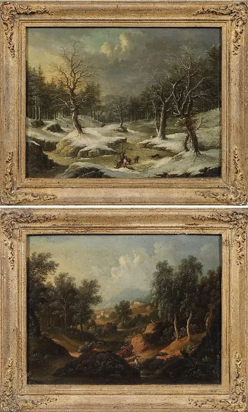 (1685 Нюрнберг - 1754 Регенсбург) Пара контрасных ландшафтов. Характерные кабинетные картины для барочного художника, по мотиву и стилю, на которых изображены охотничьи сцены, дорога, окруженная украшенными лугами и пустые деревья с различными животными, охотничьими собаками и охотниками, на заднем плане деревня или охота на кабана в летнем пейзаже с охотником, ранеными собаками и резиденцией на заднем плане. Петер фон Беммель был учеником своего отца Виллема фон Беммеля и работал как высокоуважаемый ландшафтный художник для княжеских дворов в Ансбахе, Бамберге, Вюрцбурге и других местах. Масло, на медной плите, зимний пейзаж справа и с подписью; 32 см x 24,5 см. В раме. Пара ландшафтов. Масло на меди. Зимние и летние пейзажи, с подписью.