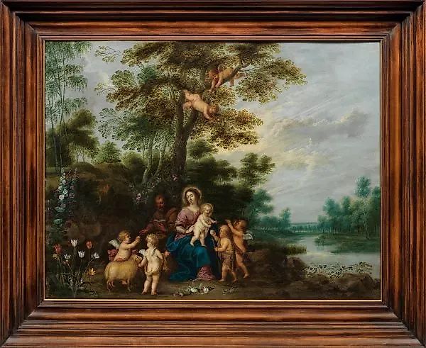 (1601 Антверпен - 1678 там же) и его мастерская, а также Питер ван Авонт (1600 Мехелен - 1652 Антверпен) Пейзаж с отдыхом в Египте, изображение Святой Семьи с Младенцем Иоанном, ангелами и Агнцем в идиллическом, усаженном деревьями фламандском пейзаже на берегу реки. Святая Семья сидит под яблоней, с которой два ангела срывают плоды, сильно желанные Иоанном, или, скорее, третий ангел, который передает их читающему Иосифу. На левой стороне изображения ягненок (Божий) подвожен ангелом, что уже алюдирует на будущую Пасху. За Святой Семьей растут розы, а также стебли роз, лежащие на земле, цветущие тюльпаны и гортензии, которые изображены как цветы с глубоким символическим содержанием. Тщательно выполненная картина принадлежит к большой серии картин, изображающих Святую Семью в пейзажах Яна Брейгеля Младшего. Скорее всего, фигуры выполнены Питером ван Авонтом (1600 Мехелен - 1652 Антверпен), который также тесно сотрудничал с Брейгелем, а также с более старшим Хендриком ван Баленом (1573/75 - 1632). В базе данных RKD в Гааге можно найти несколько сходных композиций с Святой Семьей, Младенцем Иоанном, ангелами и Агнцем, выполненных Питером ван Авонтом. Масло/медная пластина, старое крепление на деревянной панели. На обороте старая надпись: "(...) Эдем" и старая этикетка с рукописной надписью: "Куплено в Мадриде в июне 1830 года". 55,6 см х 72,4 см. Рама. Картина неоднократно входила в планы выставки в Windlestone Hall или перечней с 19 века (см. происхождение) как работа Яна Брейгеля Старшего, с фигурами, выполненными другим мастером. Происхождение: Приобретено в Мадриде в июне 1830 года сэром Уильямом Иденом, 6-м баронетом из Уэст Окленда и 4-м баронетом Мэриленда (1803-1873), Windlestone Hall, графство Дархэм, согласно ярлыку на оборотной стороне; затем передалось по наследству Лорду Джону Идену, 9-му баронету из Вест Окленда и 7-му баронету Мэриленда, Барону Иден из Уинтона (1925-2020); аукцион "Old Masters Day Sale" в Sotheby's, Лондон, 2-8 июля 2021 года, лот 125 ("Принадлежность из коллекции покойного барона Идена из Уинтона"). Ян Брейгель Младший (1601-1678) и его мастерская, фигуры, скорее всего, выполнены Питером ван Авонтом (1600-1652). Масло на меди, закреплено на панели липы. Происхождение: Приобретено в Мадриде в 1830 году сэром Уильямом Иденом, 6-м баронетом из Уэст Окленда и 4-м баронетом Мэриленда (согласно ярлыку на оборотной стороне); затем передано наследникам Джону Идену, 9-му баронету из Вест Окленда и 7-му баронету Мэриленда, Барону Иден из Уинтона (1925-2020).