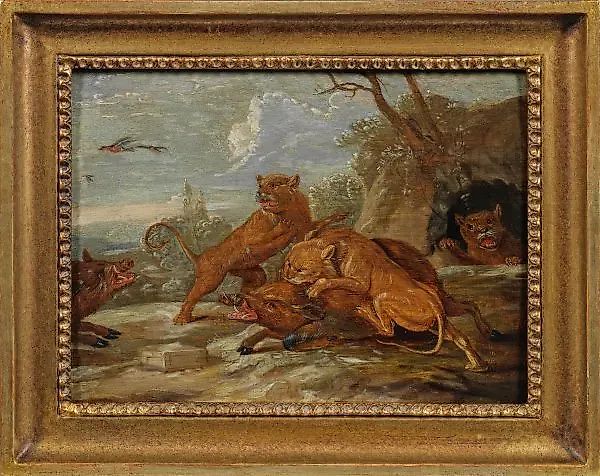 (1579 Антверпен - 1657 там же.) После того, как две львицы убили дикого кабана, на них нападает кабан. Эта картина, созданная в 18 веке, изображает главный мотив - львица, вцепившаяся зубами в шею дикого кабана. Она основана на известной крупноформатной работе "Львица против дикого кабана" Франса Снайдерса, созданной примерно в 1620-1625 годах. Оригинальная картина ранее находилась в Баварской Избирательной галерее, а затем попала в Олд Пинакотеку в Мюнхене (инв. № 620). Художник настоящей картины расширил группу персонажей, добавив дополнительных животных, и расположил их в совершенно другом пейзаже. Масло на дубовой панели. Примерно 21,5 см x 29 см. В раме. По мотивам Франса Снайдерса (1579-1657). Масло на дубовой панели.