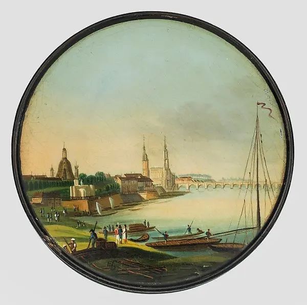 Papier-mâché, black lacquered. Round with a beveled edge. On the lid, a finely depicted view of Dresden from the left bank of the Elbe, at the height of the embarkation points. On the horizon, the city silhouette with Frauenkirche, Belvedere, Brühlsche Terrasse, Catholic Hofkirche, and Augustusbrücke. In the foreground, figures of people on the Elbe meadows, including strollers and boat builders. On the Elbe, a large sailing boat and several rowing boats. Likely based on an etching titled "Dresden from the Morning Side" by Christian Friedrich Sprinck (1769-1831). Polychrome lacquer painting. Minimal damage. Height 1.8 cm, diameter 9.5 cm. See Richard Borek Foundation, Online Catalogue - Stobwasser, under "Landscapes," item "11068. View of Dresden" (similar motif). A Brunswick paper-mâché tobacco box from the 19th century, with a city view of Dresden, probably after an etching by Christian Friedrich Sprinck (1769-1831). Minor dents. Brunswick, 1st third of the 19th century.